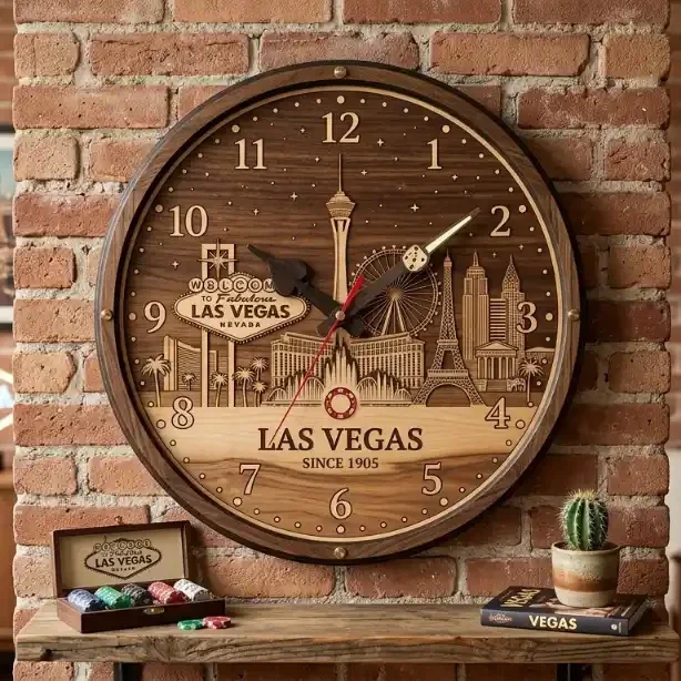 Breng de glamour van Las Vegas in huis met deze handgemaakte houten wandklok