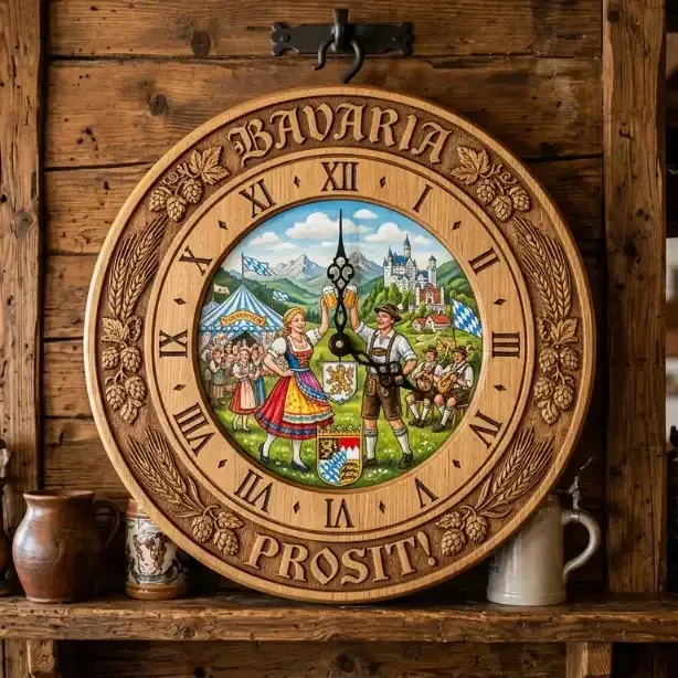Breng de sfeer van het Oktoberfest in huis met deze handgemaakte massief houten wandklok!