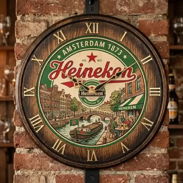 Haal de authentieke sfeer van Amsterdam in huis met deze exclusieve Heineken houten wandklok.