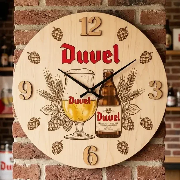 Het ontwerp is een eerbetoon aan het brouwproces: de klok is gedetailleerd gegraveerd met hopbellen en gerst, met in het midden de herkenbare Duvel fles en het iconische tulpglas. De warme houtnerven in combinatie met de strakke zwarte wijzers maken dit niet alleen een functioneel instrument, maar een echt decoratief statement.