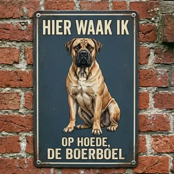 Dit robuuste metalen waakbord is een absolute must-have voor elke trotse eigenaar van dit machtige ras. Met de tekst "Hier waak ik - Op hoede, de Boerboel" laat je bezoekers op een stijlvolle maar duidelijke manier weten wie de baas is op het erf. De gedetailleerde illustratie vangt de kracht en trouw van de Boerboel perfect, afgebeeld tegen een stoere, donkere achtergrond.