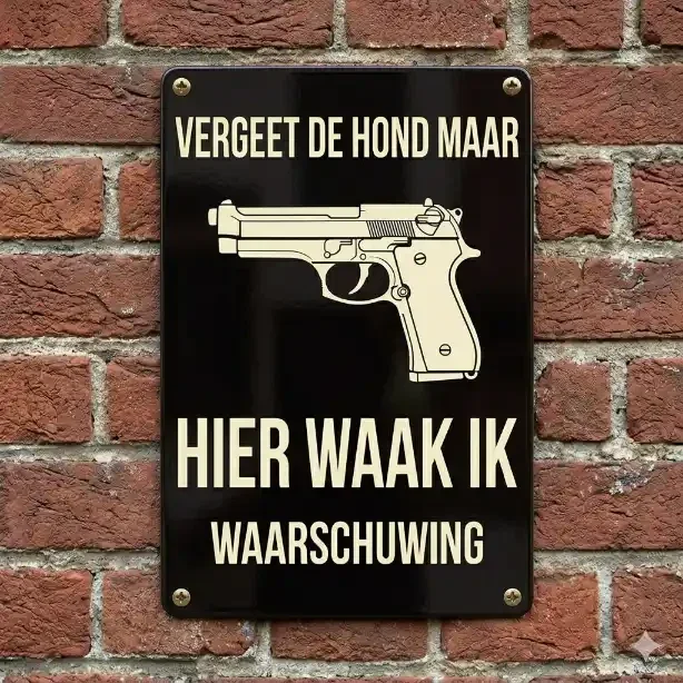 Maak een statement met een knipoog! Ben je de standaard "Hier waak ik" borden met een Duitse herder beu? Dit stijlvolle metalen tekstbord brengt de boodschap op een geheel andere manier over. Met de tekst "Vergeet de hond maar, hier waak ik" en een iconische afbeelding van een handvuurwapen, combineer je humor met een duidelijke waarschuwing voor ongewenste gasten.