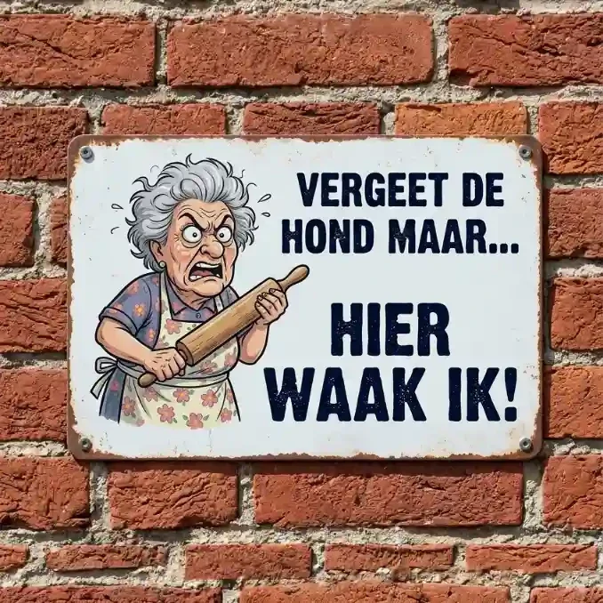 Ben je op zoek naar een origineel waarschuwingsbord met een flinke dosis humor? Dit vintage-stijl metalen bord laat er geen misverstand over bestaan wie er écht de baas is in huis. Met de tekst "Vergeet de hond maar... Hier waak ik!" en een illustratie van een strijdlustige oma met deegroller, tover je direct een glimlach op het gezicht van elke bezoeker (of schrik je ongenode gasten op een grappige manier af).