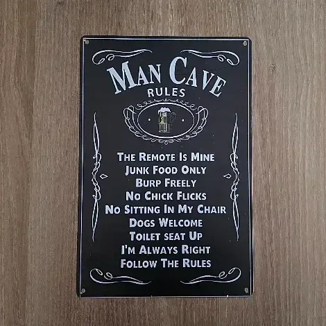 Ben jij de baas in huis, of ken je iemand die dat graag wil zijn? Dit vintage Man Cave Rules wandbord is de perfecte manier om de huisregels direct duidelijk te maken. Met een knipoog naar de klassieke bar-esthetiek en teksten als "The Remote Is Mine" en "Junk Food Only", is dit bord een geweldige ijsbreker en sfeermaker.